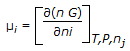 , where, n, ni and nj respectively denote the total number of moles, moles of ith species and all mole numbers except ith species. 'G' is Gibbs molar free energy. |