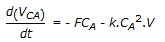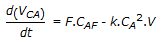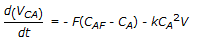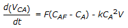 B, is carried out in a mixed flow reactor operated in semi batch mode (no exit stream). The reactant A at concentration CAF is fed to the reactor at a volumetric flow rate of F. The volume of the reacting mixture is V and the density of the liquid mixture is constant. The mass balance for A is -