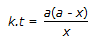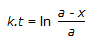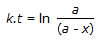 Concentration of the limiting reactant (with initial concentration of a moles/litre) after time t is (a-x). Then 't' for a first order reaction is given by