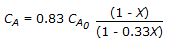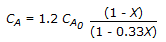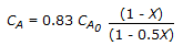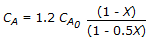 A stoichiometric mixture of A and B at 300 K is fed to the reactor. At 1 m along the length of the reactor, the temperature is 360 K. The pressure drop is negligible and an ideal gas behaviour can be assumed. Identify the correct expression relating the concentration of A at the inlet (CA0), concentration of A at 1m (CA) and the corresponding conversion of A (X). -