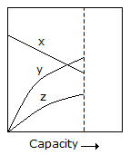 Characteristic curves for a centrifugal pump plotted against its capacity is shown in the diagram. x, y and z denote respectively