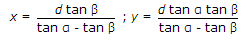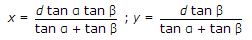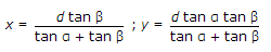 P and Q are two stations on the shore line at distance d. If the angle between Q and the boat O and P is a and the angle between P and Q at boat O is Ã2;, the x and y. Coordinate along PQ and perpendicular to PQ from O are :