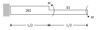 The stepped cantilever is subjected to moments, M as shown in the figure below. The vertical deflection at the free end (neglecting the self weight) is