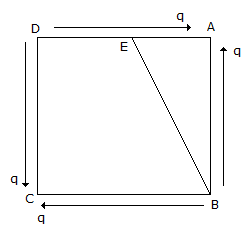 The rectangular block shown in the given figure is subjected to pure shear to intensity 'q'. If BE represents the i principal plane and the principal stresses are σ1, σ2 ; then the values of θ, σ1 and σ2 will be respectively.