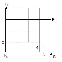 Figure shows the forces acting on a body. Each square is 3 cm x 3 cm. If F1 = 30 N, F2 = 15 N, F3 = 25 N and F4 = 20 N, the resultant force and the moment about point O, respectively, are