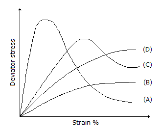 A highly sensitive undisturbed clay sample was brought to the laboratory and UU test was performed. The curve of deviator stress versus strain % plot will be (among the four curves shown in the given figure) the one labelled