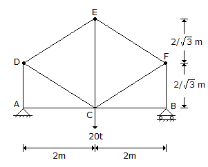 A pin-jointed truss is loaded as shown in the given figure. The force in member CE is