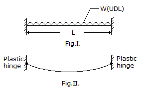 A fixed beam as shown in Fig. I is loaded with a U.D.L. over the entire span, the total load being W; when load was just increased to W1, the deformed shape as shown in Fig. II was seen. The value of W1 (plastic moment of resistance = Mp) is
