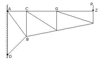 3. A cantilever pin-jointed truss carries one load P at the point Z as shown in the given figure. The hinges in the vertical wall are at A and D. The truss has only three horizontal members AC, CG and GZ.