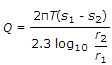 A well penetrates to 30 m below the static water table. After 24 hours of pumping at 31.40 litres/minute, the water level in a test well at a distance of 80 m is lowered by 0.5 m and in a well 20 m away water is lowered by 1.0 m. The transmissibility of the auifer, is