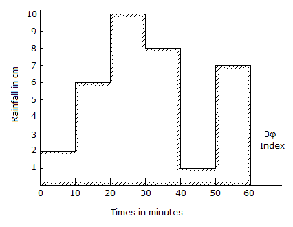 The rate of rainfall for successive 10 minute periods of a 60 minute duration storm, are shown in the below figure. If the value of φindex is 3 cm/hour, the run off will be
