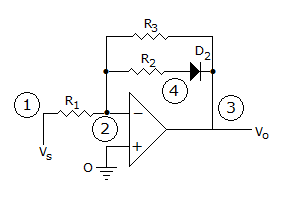 Following figure is a signal conditioning Amplifier, changes gain depending upon the polarity of Vs. What will be circuit voltage gain for + Vs and for - Vs if D2 is ideal.
