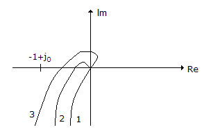 The given figure shows three Nyquist plots of G(s) H(s) = e-sT/[s(s + 1)] for different values of T. The curves 1, 2, 3 can be