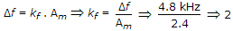 In an FM system, when the AF is 500 Hz and the AF voltage is 2.4 V, the deviation is 4.8 kHz. If the AF voltage is now increased to 7.2 V, the new deviation will be