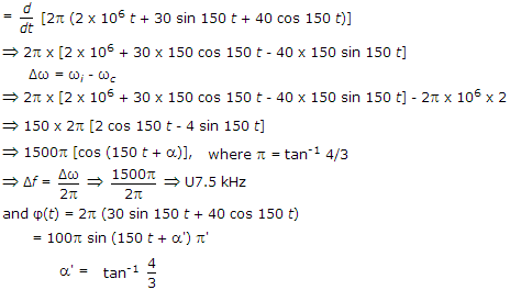 9. An angle modulated signal is given by s(t) = cos 2p (2 x 106t + 30 sin 150t + 40 cos 150t). The maximum frequency and phase deviations of s(t) are