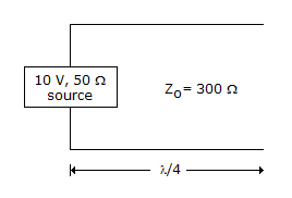 Consider a 300 Ω, quarter wave long at 1 GHz transmission line as shown in figure. It is connected to a 10 V, 50 Ω source at one end is left open circuited at the other end. The magnitude of the voltage at the open circuit end of the line is