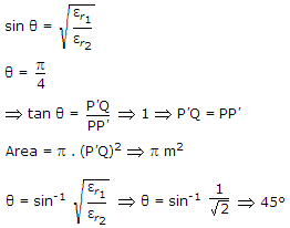 A medium of relative permittivity εr2 = 2 forms an interface with free space. A point source of EM energy is located in the medium at a depth of 1 meter from the interface. Due to the total internal reflection, the transmitted beam has a circular cross-section over the interface. The area of the beam cross section at the interface is given by