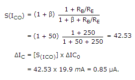 Calculate the stability factor and change in Ic from 25°C to 100°C for, β = 50, RB/RE = 250, ΔICO = 19.9 nA for emitter bias configuration