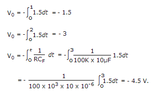 For a integrator circuit, Ri = 100 KΩ, CF = 10 μF. The input is a step dc voltage as shown below. Its output will be