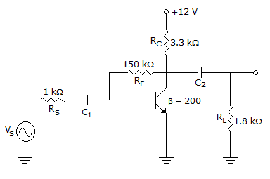 For the collector-feedback amplifier shown below the voltage gain Av will be __________ .