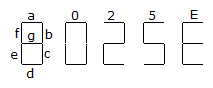 If both P1 and P2 are pressed, 'E' is displayed, signifying 'Error'. The names of the segments in the 7-segment display, and the glow of the display for '0', '2', '5' and 'E', are shown below.