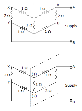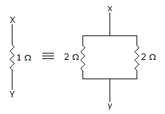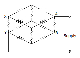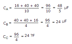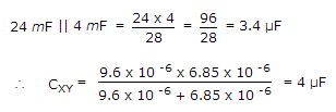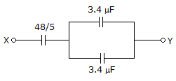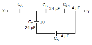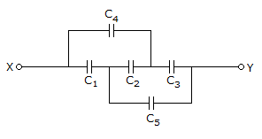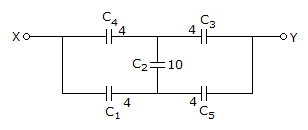 The capacitors C1, C3, C4 and C5 have a capacitance of 4 μF each and the capacitor C2 has a capacitance of 10 μF. The effective capacitance (in μF) between the points X and Y will be