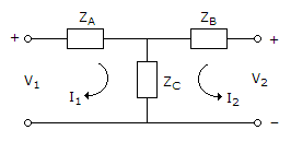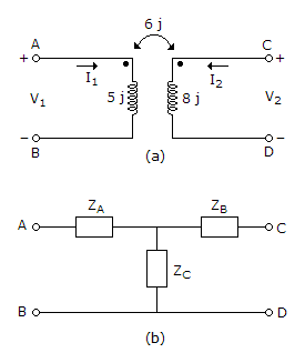 The equivalent T circuit of this coupled network is shown in figure. Find the values of ZA, ZB and ZC.