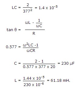 In a series LCR circuit the maximum inductor voltage is twice the maximum capacitor voltage however current lags by 30° and drop across the inductance is vL = 100 sin 377t V. Assuming the resistance being 20 Ω, Find the values of the capacitance and inductance.