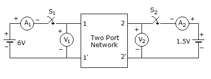A two port network shown below is external dc sources. The voltages and the currents are measured with voltmeters V1 V2 and ammeter A1 A2 (all assumed to be ideal), as indicated. Under following switch conditions, the readings obtained are: