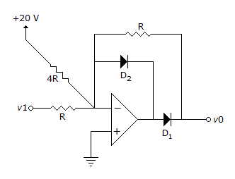 The transfer characteristic for the precision rectifier circuit shown below is (assume ideal OP-AMP and practical diodes)