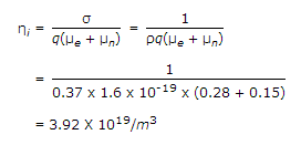 If the intrinsic resistivity at 300°K is 0.37 ohm-m and the electron and hole mobilities at 300°K are 0.28 and 0.15 m2/volt-sec, then the intrinsic carrier concentration of Germanium is __________ .