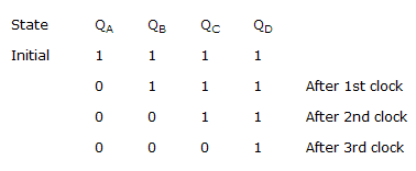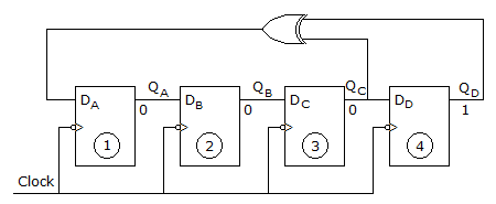 Figure shows four D type FFs are connected as a shift register using an XOR gate. The initial state and 3 subsequent states for 3 clock pulses are also given