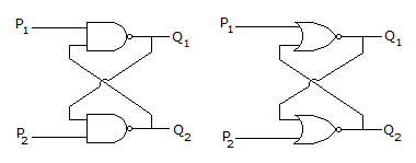 Refer to the NAND and NOR latches shown in the figure. The inputs (P1, P2) for both the latches are first made (0, 1) and then, after a few seconds, made (1, 1). The corresponding stable outputs (Q1, Q2) are