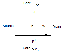 The cross section of a JFET is shown in the following figure. Let Va be - 2 V and let Vp be the initial pinch-off voltage. If the width W is doubled (with other geometrical parameters and doping levels remaining the same), then the ratio between the mutual transconductances of the initial and the modified JFET is