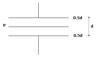 A parallel plate capacitor has area of plate A and plate separation d. Its capacitance is C. A metallic plate P of area A and negligible thickness is added as shown in Figure. The new value of capacitance is
