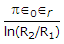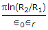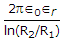 Two coaxial metallic cylinders have radii R1 and R2. The space between them is filled with a dielectric having dielectric constant ∈r. The capacitance per metre length is