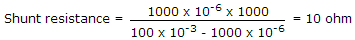 A meter having 0-1000 μA range and 1000 Ω resistance is required to be changed to 0-100 mA meter. The value of shunt resistance is about