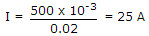 A moving coil meter has a shunt of 0.02 Ω resistance. If coil resistance is 1000 Ω and a potential difference of 500 mV is required across it to cause full scale deflection, the current through shunt is