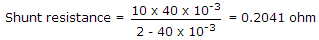 A moving coil meter has 10 Ω resistance and requires 40 mA for full scale deflection. The shunt resistance required to convert it into 0-2 A ammeter is
