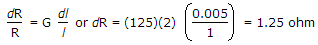 A wire strain gauge has a gauge factor of 2, resistance of 125 Ω and length 1 m. If length of wire changes by .005 m, change in resistance will be