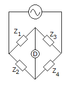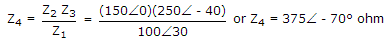 The ac bridge in figure is balanced. Z1 = 100∠30°, Z2 = 150∠0°, Z3 = 250∠ - 40° Then Z4 =