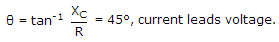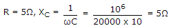 A series RC circuit has R = 5 Ω and C = 10 μF. The current in the circuit is 5 sin 20000t. The applied voltage is