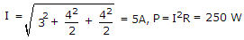 The current in a circuit with 10 Ω resistance is i = 3 + 4 sin (100 t + 45°) + 4 sin (300 t + 60°) A. The rms current and power dissipated are