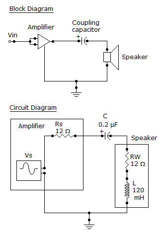 Determine the frequency at which the maximum power is transferred from the amplifier to the speaker in the given figure.