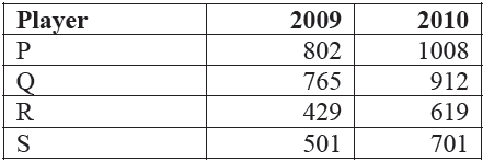 The total runs scored by four cricketers P, Q, R, and S in years 2009 and 2010 are given in the following table: The player with the lowest percentage increase in total runs is