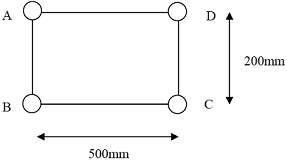 The stiffened cross-section of a long slender uniform structural member is idealized as shown in the figure below. The lumped areas at A, B, C and D have equal cross-sectional area of 3 cm2. The webs AB, BC, CD and DA are each 5 mm thick. The structural member is subjected to a twisting moment of 10 kNm. The magnitudes of the shear flow in the webs, qAB, qBC, qCD, and qDA in kN/m are, respectively