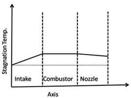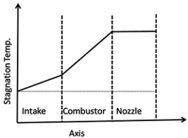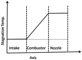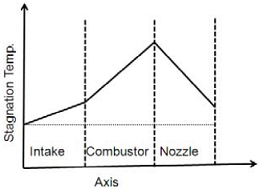 - Which one of the following shows the CORRECT variation of stagnation temperature along the axis of an ideal ram jet engine?
