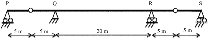 Beam PQRS has internal hings in spans PQ and RS as shown. The beam may be subjected to a moving distributed vertical load of maximum intensity 4 kN/m of any length anywhere on the beam. The maximum absolute value of the shear force (in kN) that can occur due to this loading just to the right of support Q shall be: