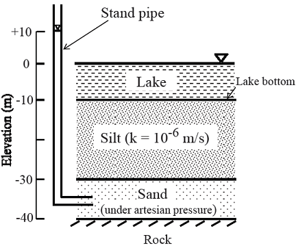 The soil profile below a lake with water level at elevation = 0 m and lake bottom at elevation = -10 m is shown in the figure, where k is the permeability coefficient. A piezometer (stand pipe) installed in the sand layer shows a reading of +10 m elevation. Assume that the piezometric head is uniform in the sand layer. The quantity of water (in m3/s) flowing into the lake from the sand layer through the silt layer per unit area of the lake bed is: