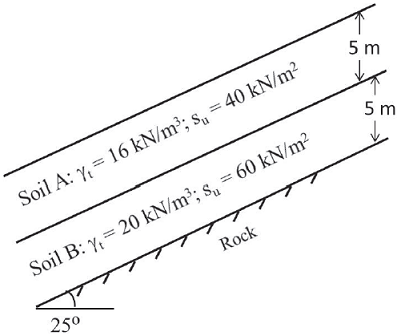 The soil profile above the rock surface for a 25o infinite slope is shown in the figure, where su is the undrained shear strength and Ï’t is total unit weight. The slip will occur at a depth of